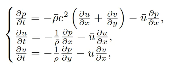 Above, u,v,p denote, respectively, the velocities in the x,y directions and the pressure deviation from the average, while is the density of the environment, and c is the speed of the sound.