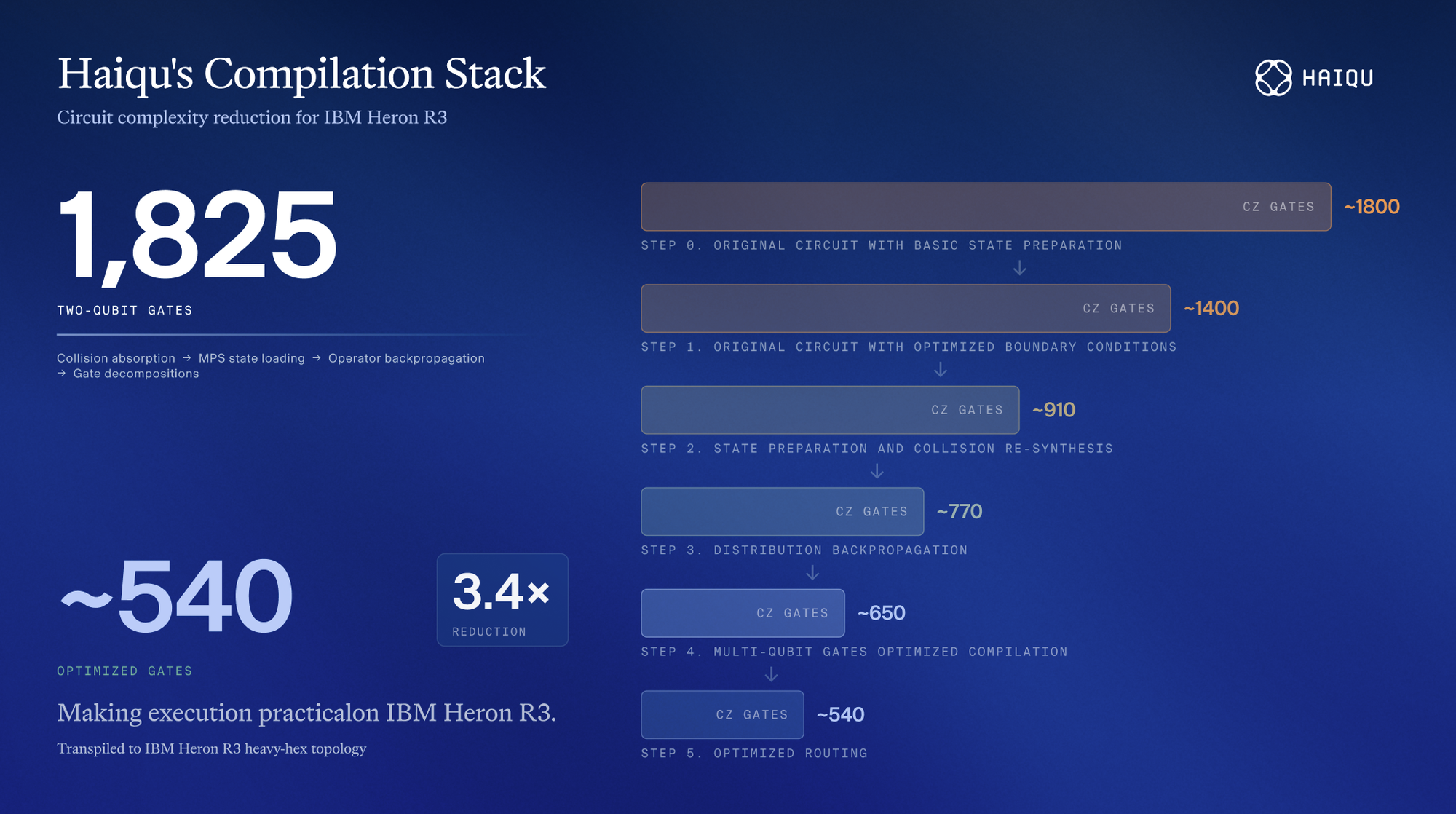 The compilation challenge was substantial. A direct, unoptimized implementation produces approximately 1,825 two-qubit gates after transpilation to the Heron R3 heavy-hex connectivity. This is far beyond what today's error rates allow to execute accurately enough. Haiqu's optimization pipeline brought this down to around 540 two-qubit gates through several coordinated approaches.