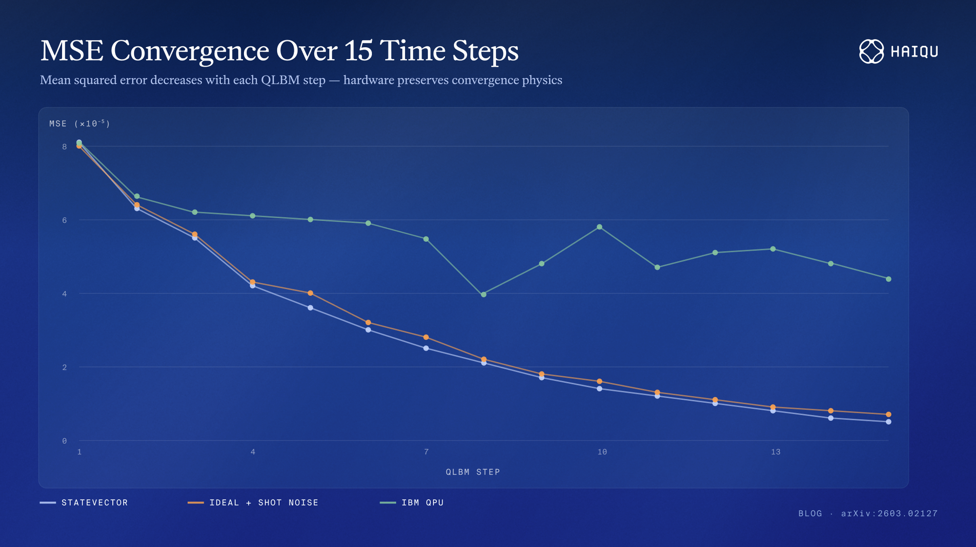 Left: Ideal vs. hardware field maps after 15 time steps for ρ, u_x, u_y Right: MSE convergence plot (statevector, ideal + shot noise, IBM QPU). The IBM QPU execution is noisier but continues to reduce error with subsequent steps — evidence that hardware preserves the convergence physics.