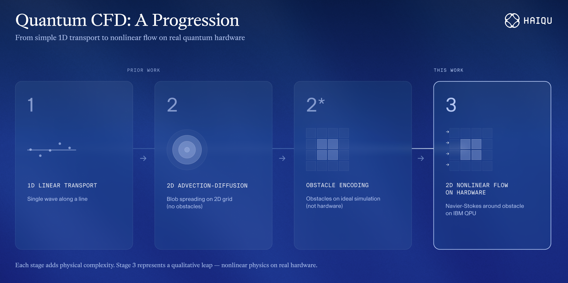 So far, the complete record of QLBM on actual quantum processors — including our own earlier work with Quanscient on IonQ Aria (2024, the largest QLBM grid demonstrated on hardware) — has been limited to linear dynamics on 1D, 2D, and 3D grids. No obstacles. No boundaries beyond periodic conditions. No coupled velocity fields. Each result was an important milestone but the physics that makes real CFD hard was entirely absent from the hardware record.