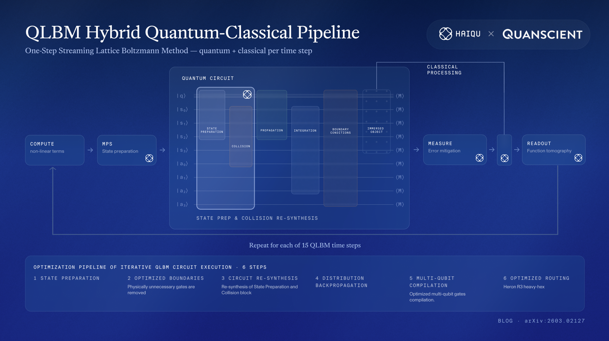 Our joint paper with Quanscientr introduces a new quantum algorithm for the lattice Boltzmann method based on the one-step simplified LBM (OSSLBM) and validates it across several cases, culminating in a nonlinear laminar flow benchmark on real quantum hardware.