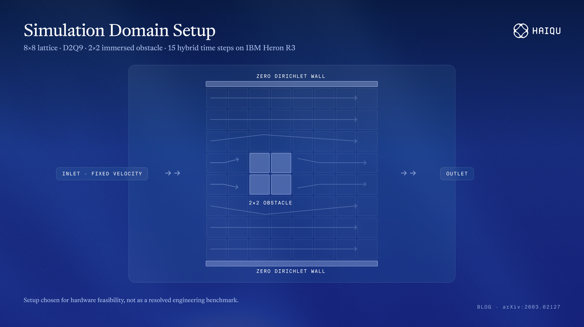 The benchmark: a D2Q9 lattice on an 8×8 grid with a 2×2 immersed square obstacle, inlet-outlet boundary conditions, and zero Dirichlet walls. Flow is driven by a fixed inlet velocity, deflects around the obstacle, and evolves through a 15-step hybrid quantum-classical loop on IBM's ibm_boston processor (Heron R3, 156 qubits).