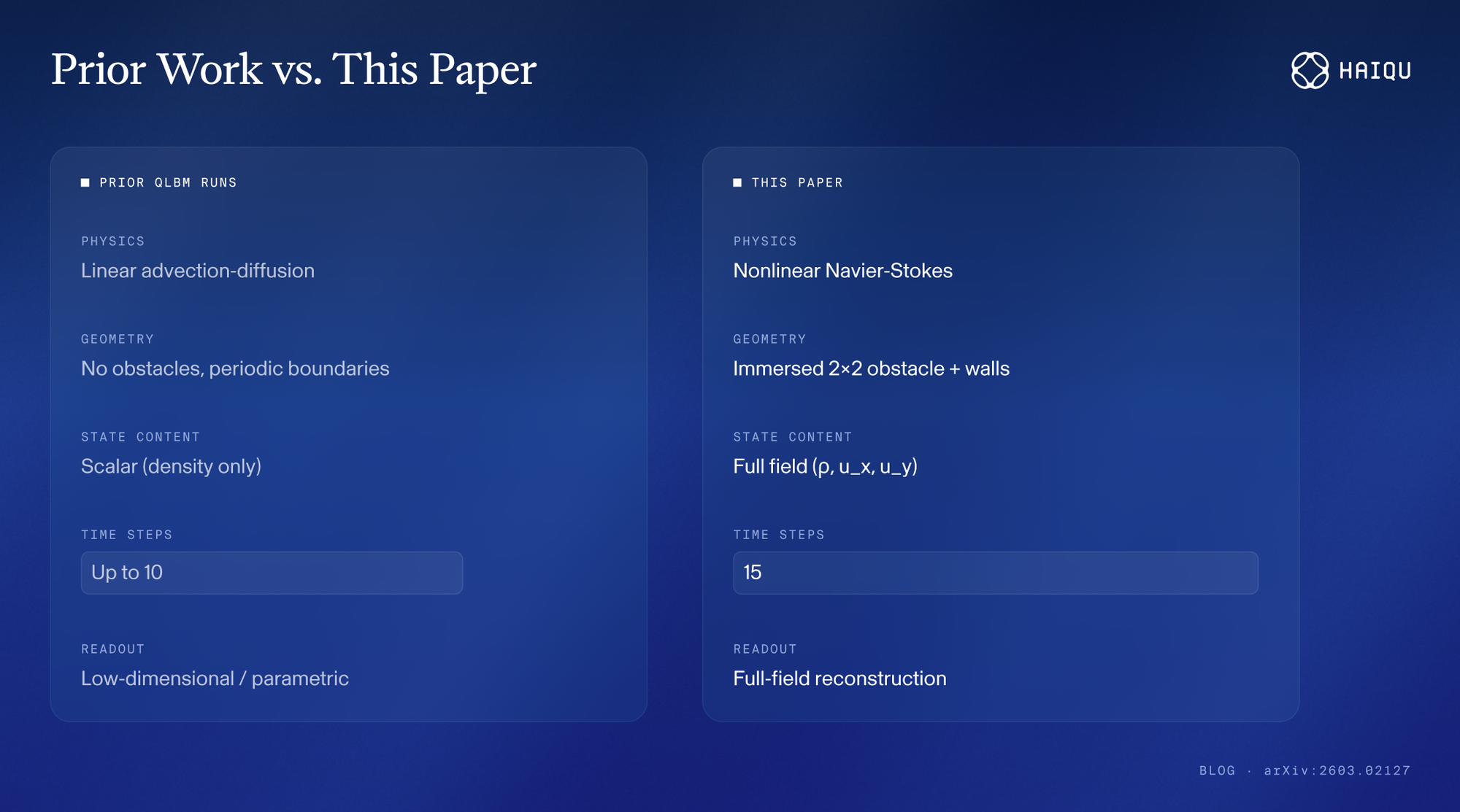 These results are important because they demonstrate QLBM on real quantum processors, moving toward the very features that make real CFD hard: obstacles, boundaries, coupled fields, and nonlinear dynamics. The grid size is still very small, but the problem difficulty is a qualitative leap.